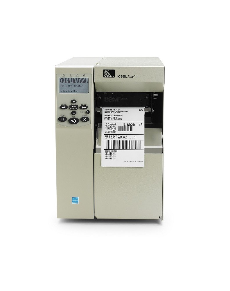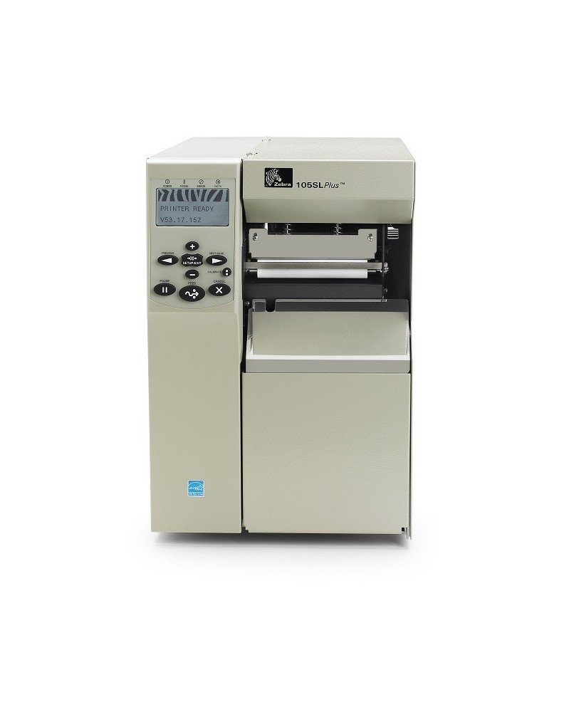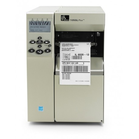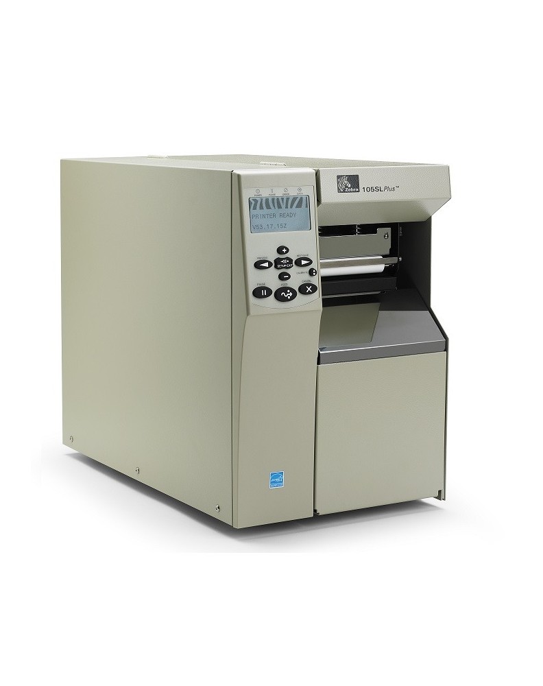 Zebra 105SL Plus imprimante étiquette transfert thermique, Résolution: (203 dpi), largeur de médium (max.): 114 mm, largeur d'impression (max.): 102 mm, diamètre de rouleau (max.): 203 mm, vitesse (max.): 305 mm/s, multi-interface (RS232, USB, parallèle), serveur d'impression (interne 10/100), ZPLII, RAM: 16 Mo, flash: 8 Mo, horloge temps réel, écran LCD, cellules ajustables.